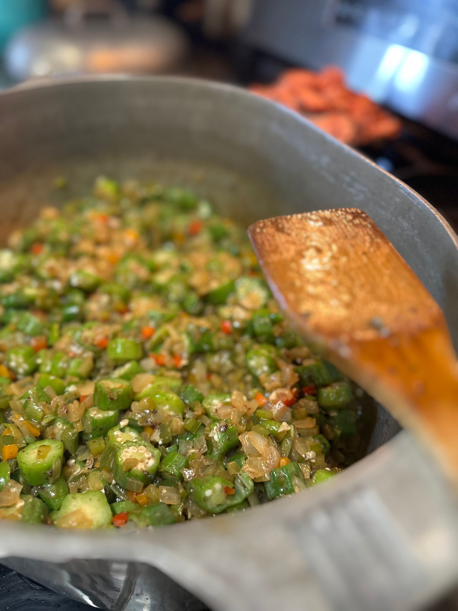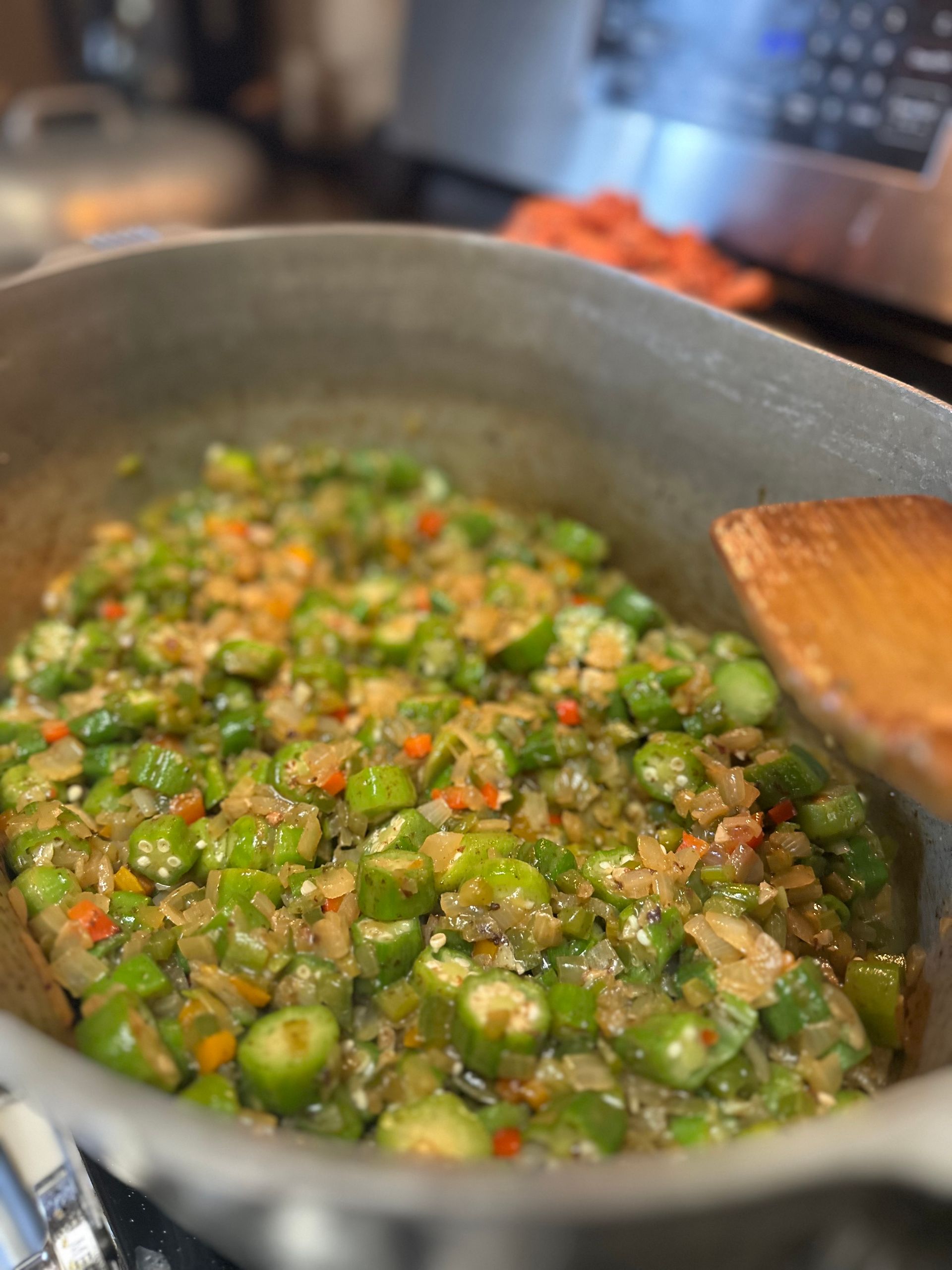 The key is adding the okra frozen and cooking it down before adding the broth. Allowing it to sauté and reduce helps remove most of the mucilage (the “slime”), leaving a thick gumbo texture without the gooey feel.
