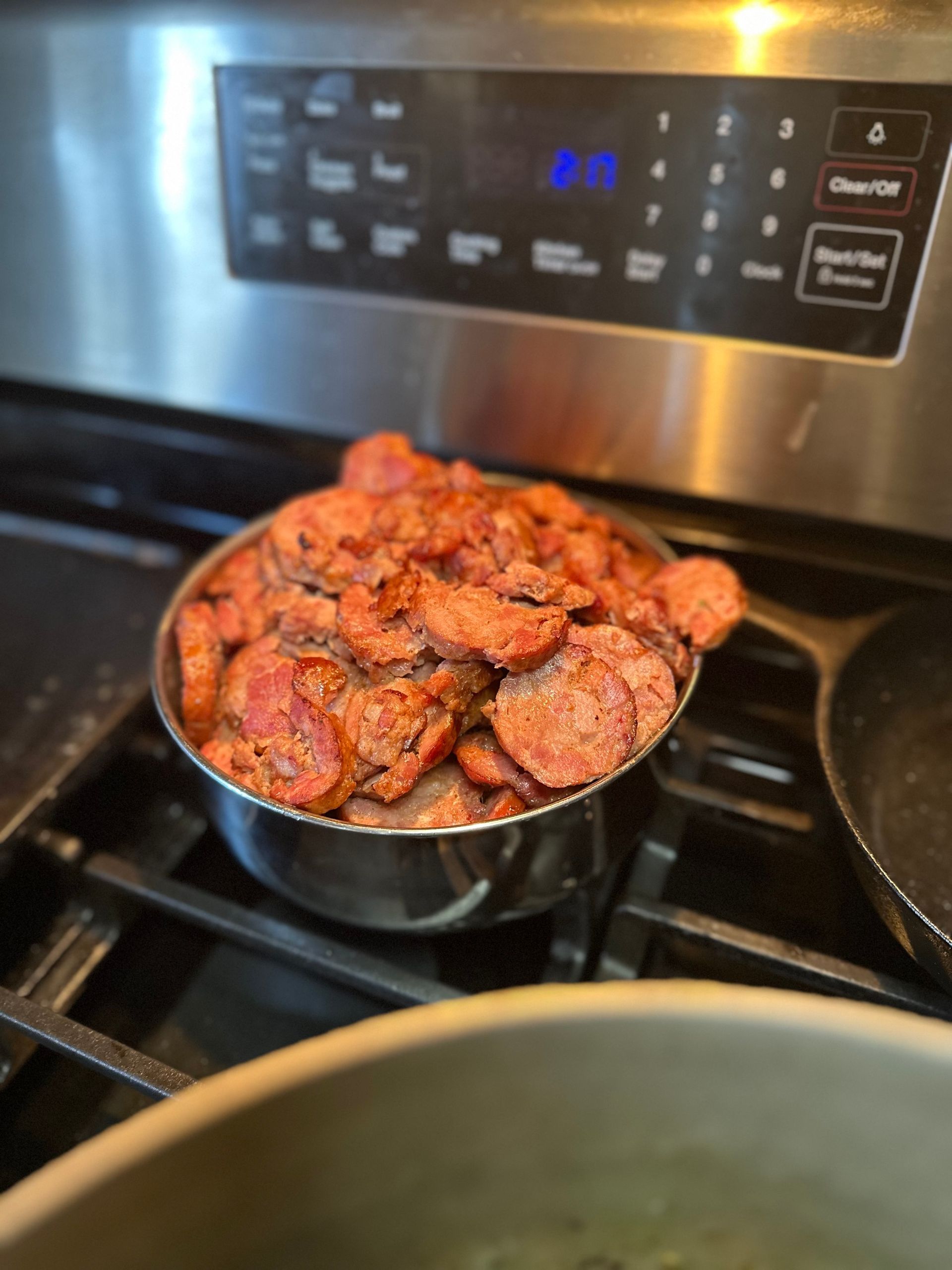 Now back to the cooking, add your sausages to the pot and get some good color on them. Once they’re browned, pull them from the pot and set them aside. Those additional drippings and the color that has formed on the bottom of the pot from frying the sausages will help with your overall color. Now add the onions, celery and bell peppers. Sweat them down a bit and make sure you scrape up all those drippings. Add in the minced garlic after your trinity has cooked down a bit. If you add the garlic too early, it may burn.