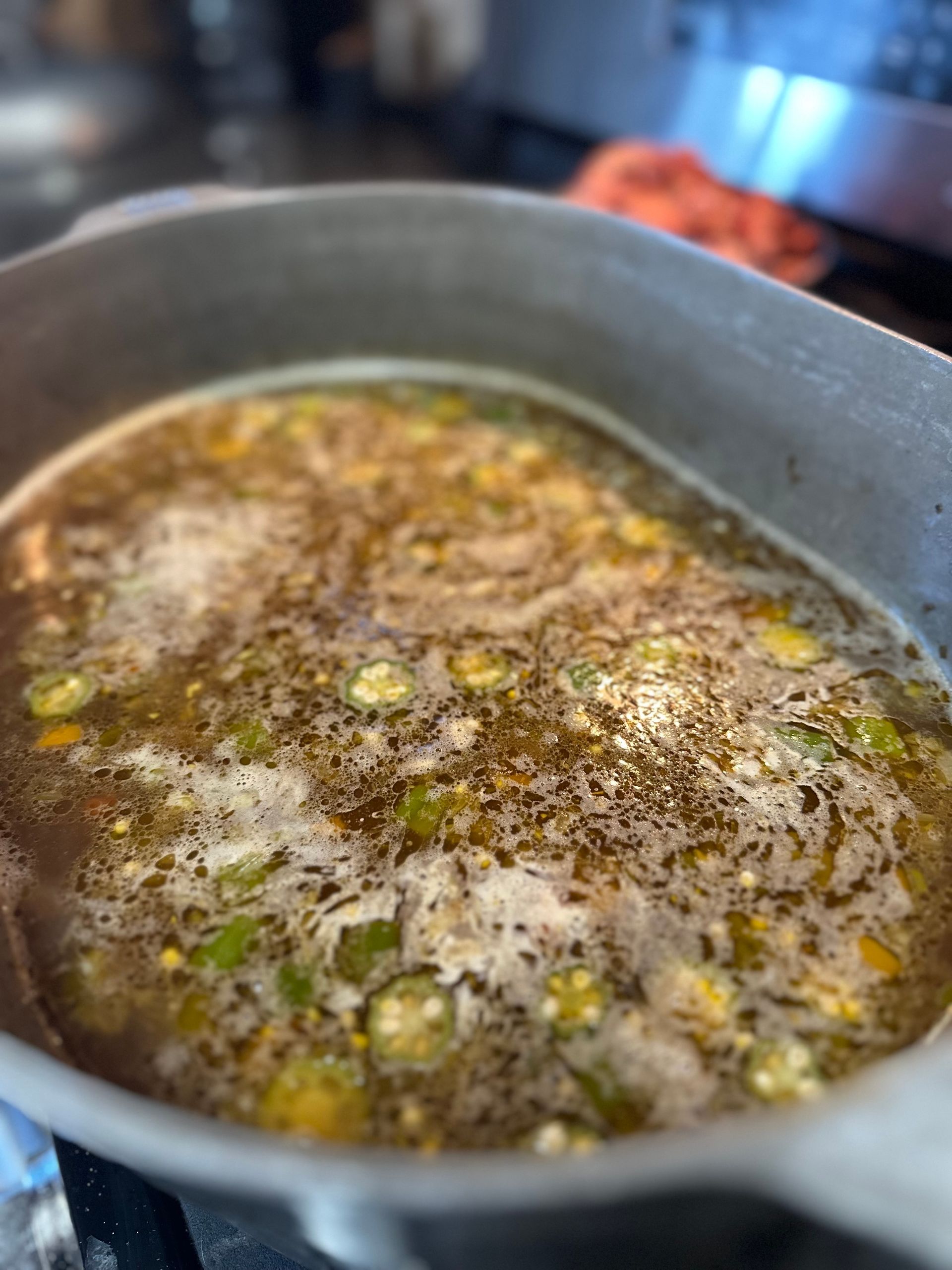 Then I added cut okra right from the freezer. Now I know everyone will say “ewww that’s gonna be slimy” but keep in mind we’re skipping the roux! I do cook it down a bit which gets rid of some of the sliminess that everyone is sure to be concerned about. Now we scoop out some of our bone broth that was made in the Crockpot. I like to add a little bit at a time to keep that strong simmer going.