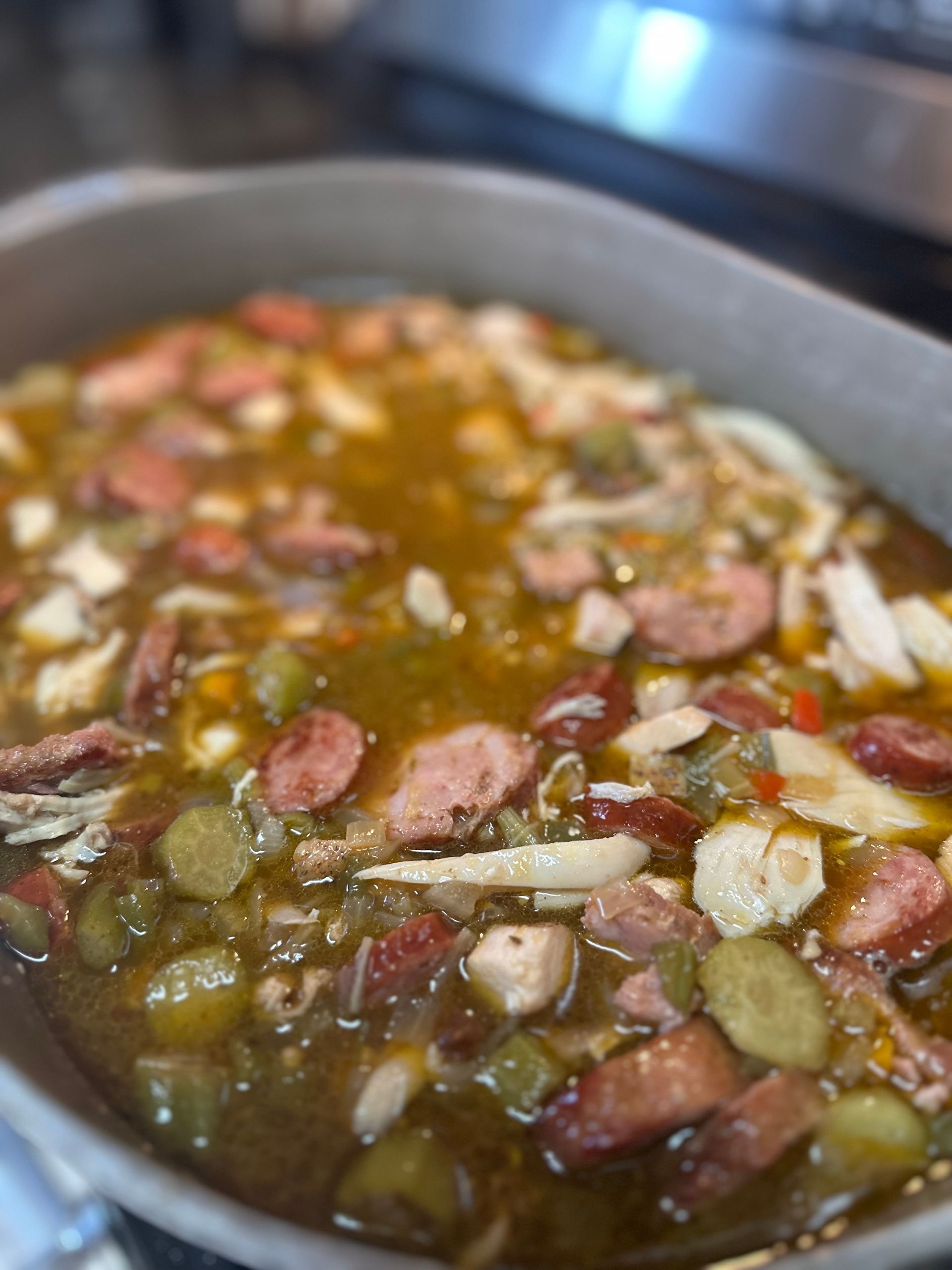 The cheat code for the chicken in this recipe is store bought rotisserie chickens. Smoking your own chicken also adds a great depth of flavor. Pull all of the meat from the bones and use the bones for your broth. A gumbo is only as good as the ingredients you use. It all starts with a rich home made chicken bone broth. For this recipe, we used my homemade chicken stock that I make by slow cooking in the crockpot for about 24 hours.